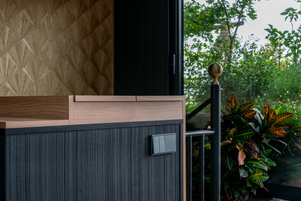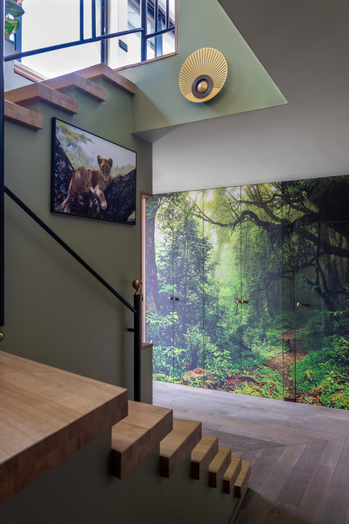 L’entrée de leur appartement profite immédiatement de la lumière naturelle. D’un côté, la lumière descend par la percée créée par l’escalier, de l’autre elle rentre par la porte coulissante toujours ouverte de la chambre principale. Un papier peint naturaliste cache les placards et les toilettes en laissant penser qu’un chemin se prolonge à travers la forêt.