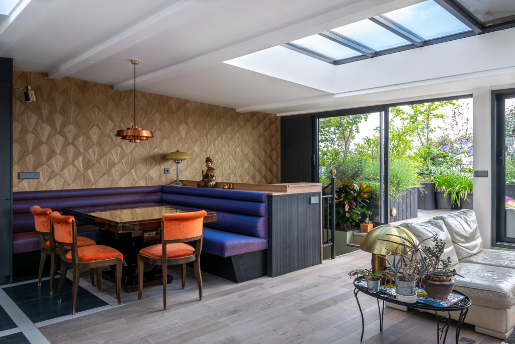 En haut, l’espace est spectaculaire, bas mais ouvert sur 3 côtés et profitant de deux grande verrières en toiture. Une immense baie vitrée vient s’ouvrir sur la terrasse. La salle à manger vient se positionner dans un angle extrêmement cosy avec une banquette dessinée sur mesure. Le papier peint en marqueterie de bois réchauffe cet endroit par sa teinte douce.
