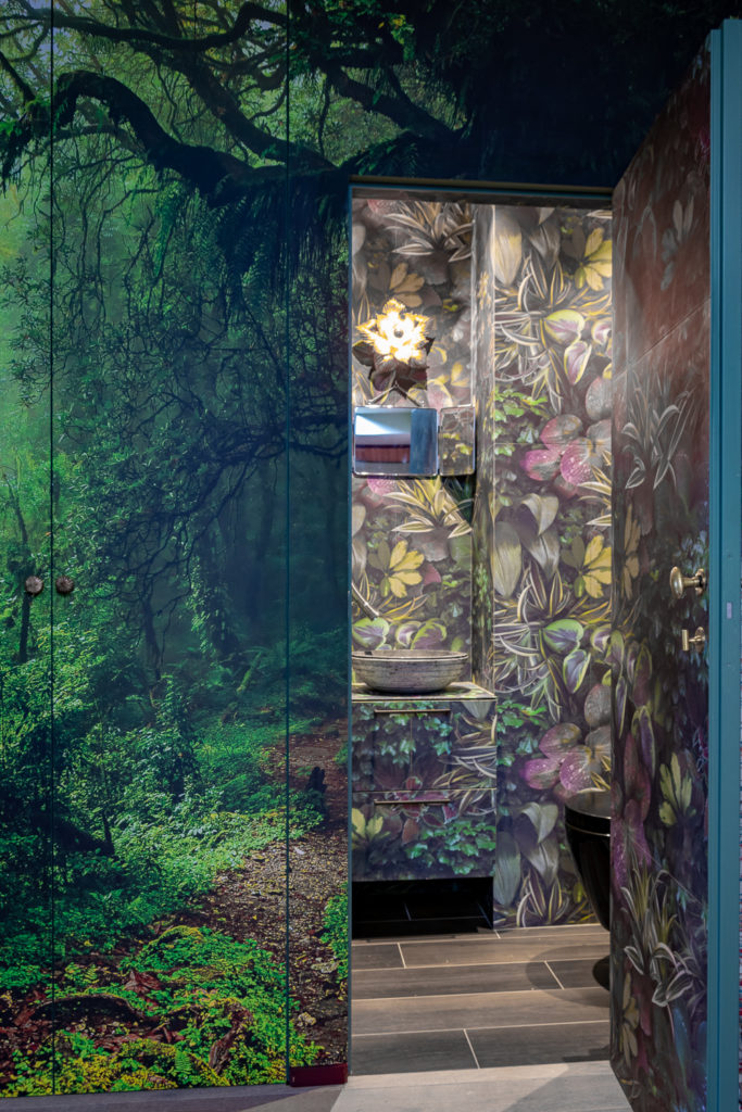Derrière ces portes se cache un espace toilette lui aussi entièrement carrelé de feuilles sur tous ses murs.