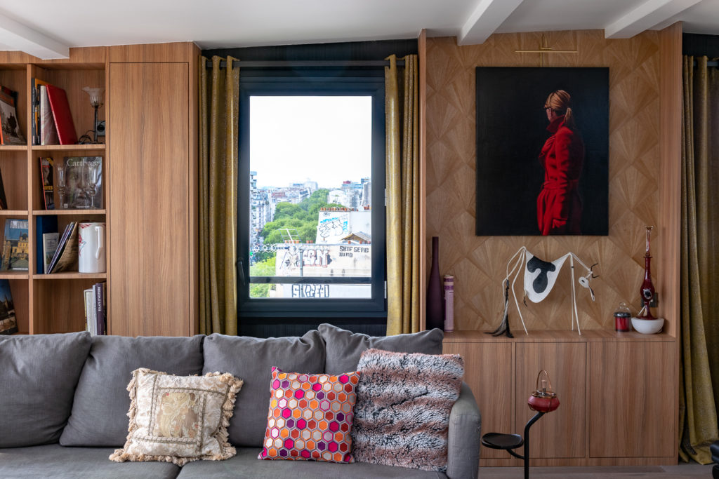 Le salon vient s’adosser à une bibliothèque dessinée sur mesure agrémentée de papier peint marqueté ou noir texturé. Les rideaux viennent s’intercaler à chaque fenêtre pour augmenter la sensation de verticalité et donner le sentiment d’un volume plus haut.