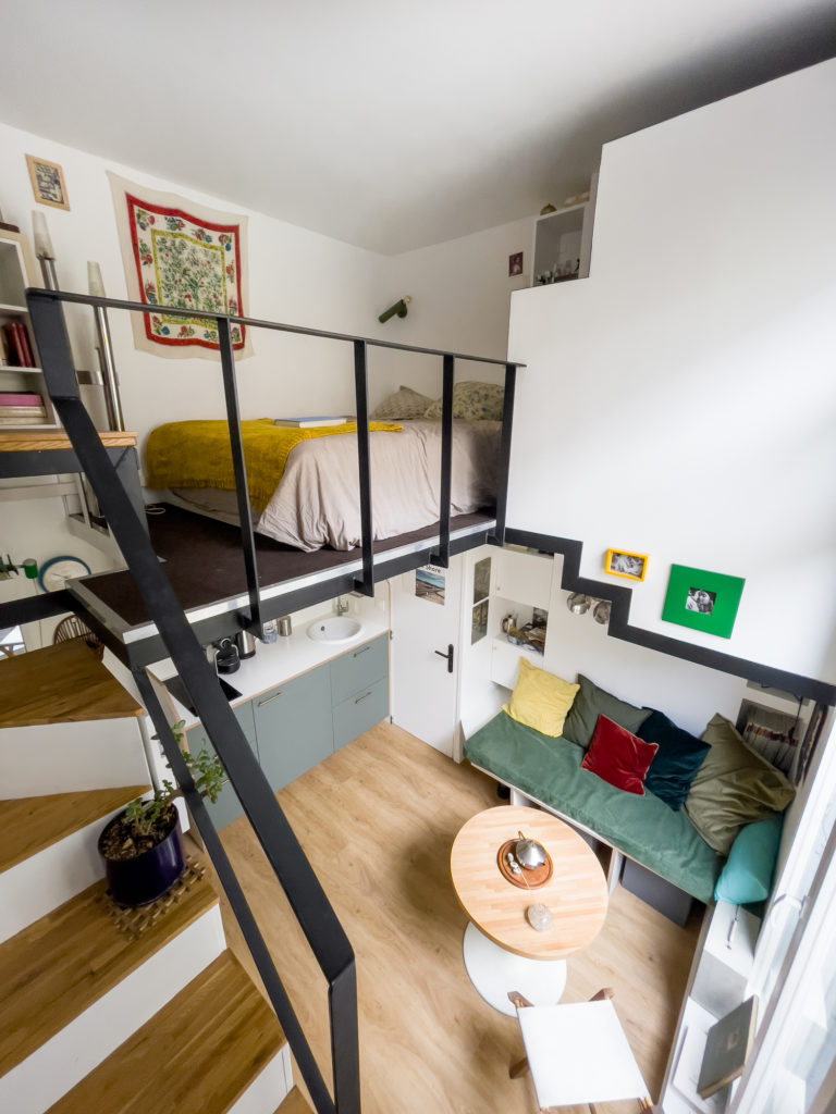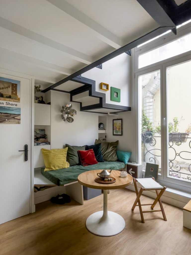 De l’autre côté, profitant de la grande fenêtre qui fait toute la hauteur du studio, le coin salon/salle à manger. En effet, les hauteurs des assises et des tables ont été calculées pour permettre les deux usages aisément. La porte à gauche est celle du toilette indépendant. Au dessus, le volume en escalier correspond à celui de la douche, suspendue au dessus du salon et accessible depuis la chambre!!