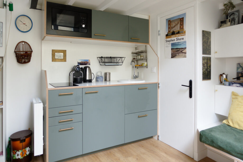 La cuisine profite de nombreux rangement et d’un plan de travail en Contreplaqué filmé blanc. A droite, l’accès aux toilettes indépendants.