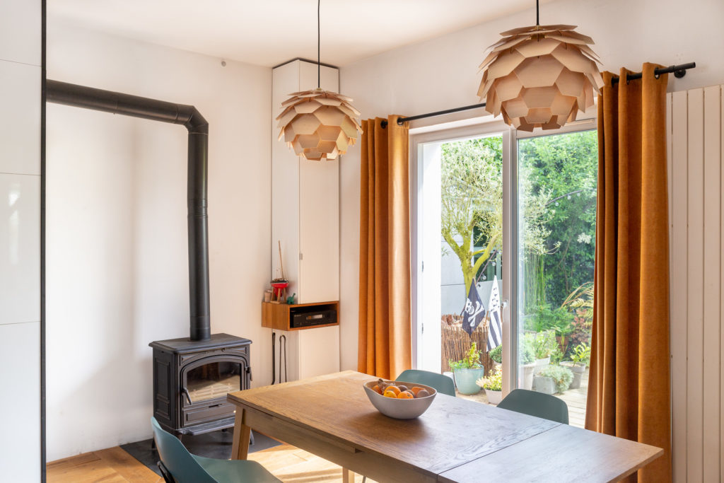 La salle à manger est maintenant située près du jardin, à côté du poêle à bois poru un moment de convivialité et de partage.
