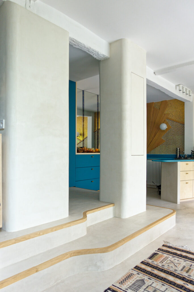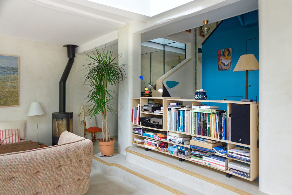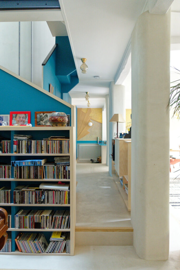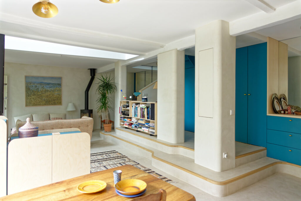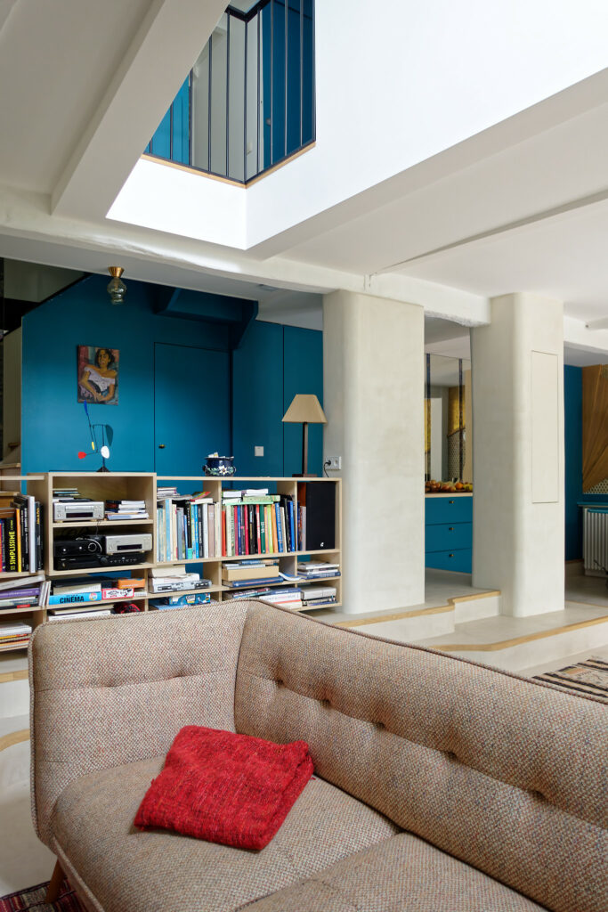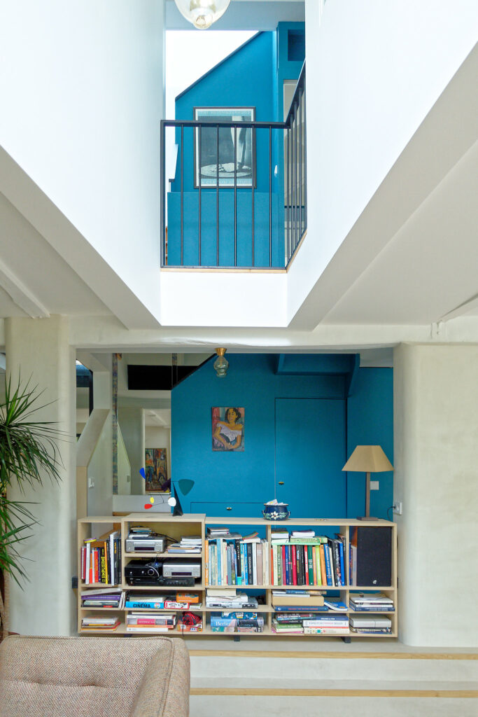 La couleur bleue des meubles du fond de la pièce de vie se retrouvant à l’étage crée un lien entre les deux niveaux.