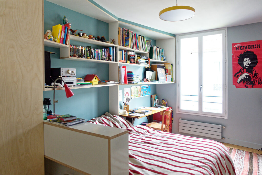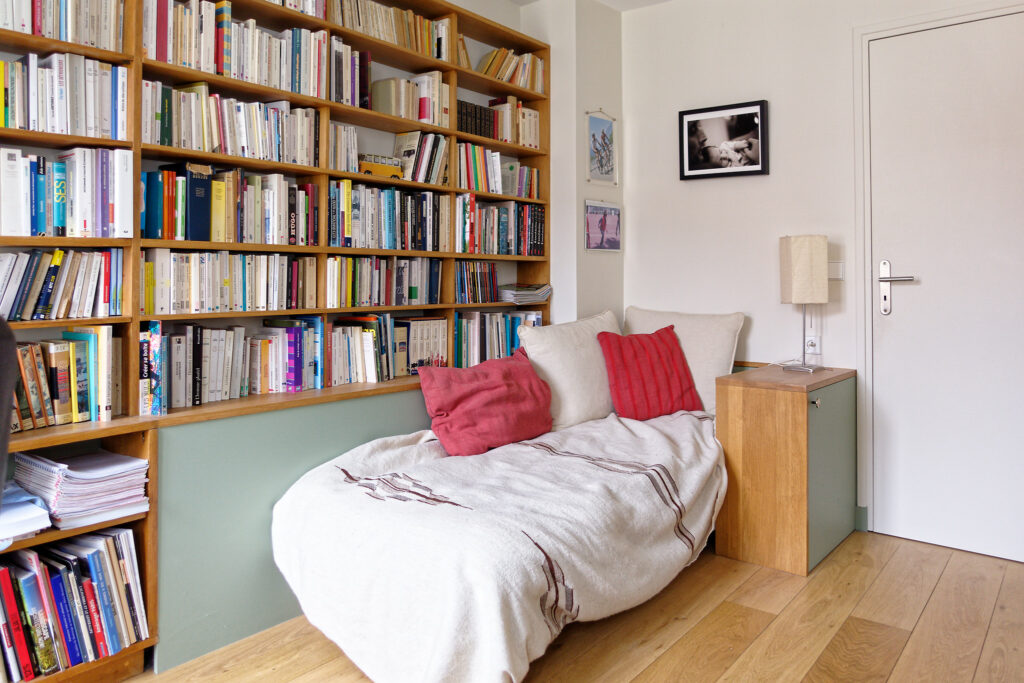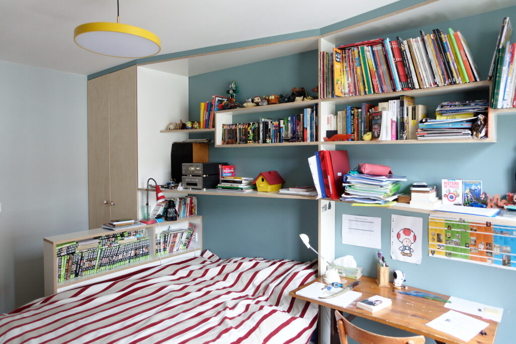 La chambre enfant a été entièrement ré-agencée pour y placer un grand placard et une grande bibliothèque sur mesure avec des biais qui permettent d’y ranger des livres de différentes profondeurs.