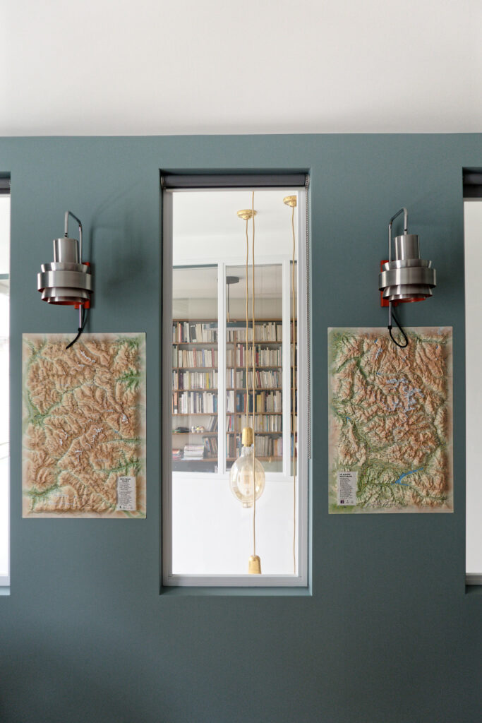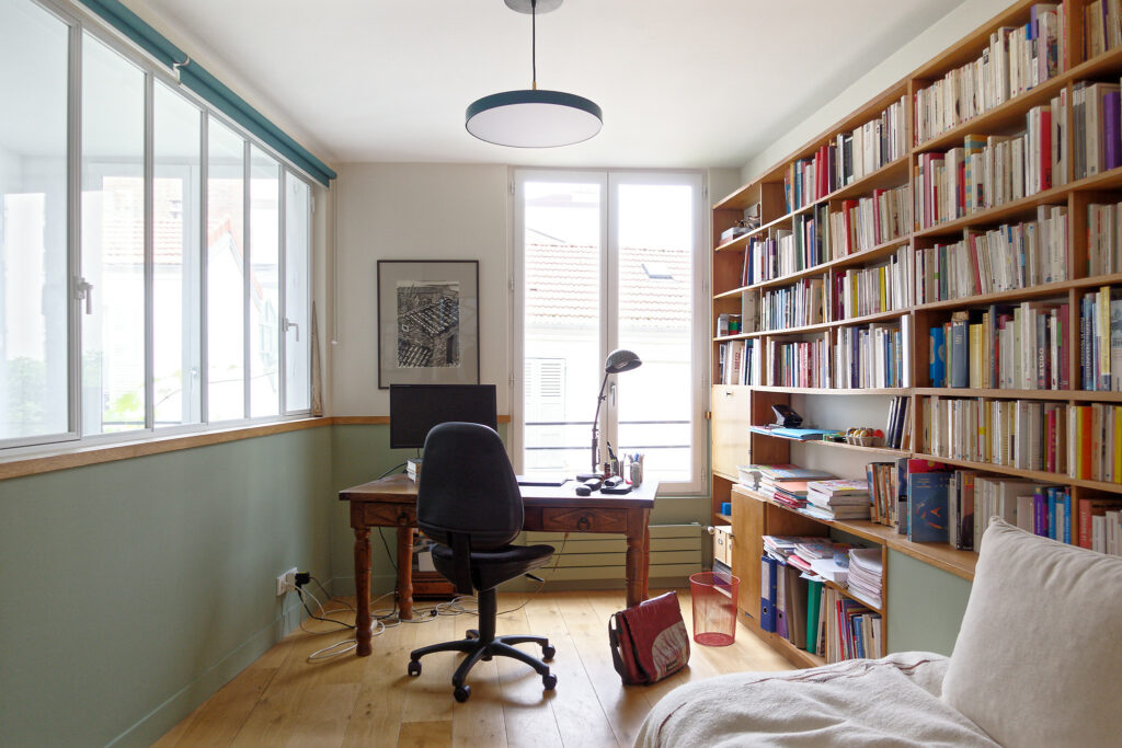 Le bureau profite d’une grande verrière métalliques blanche avec des parties ouvrantes. De l’autre côté, une très grande bibliothèque en chêne habille tout le mur. Ici, c’est un vert/gris doux qui se pose sur les murs.