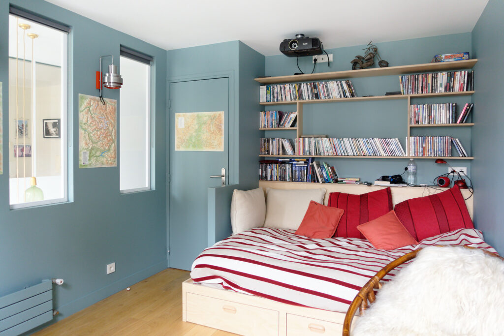 Une petite bibliothèque sépare le lit de l’espace dressing et donne au lit une vraie place. Le bureau vient se poser naturellement proche de la lumière à gauche de la fenêtre. Des tons de bleus doux ont été peints sur les murs.
