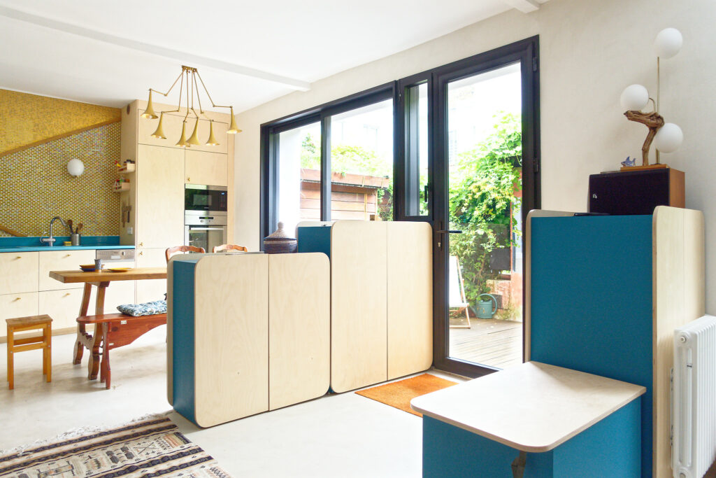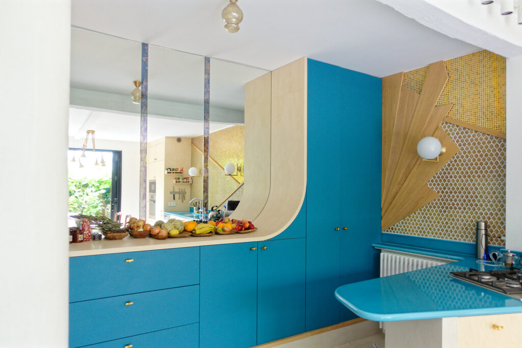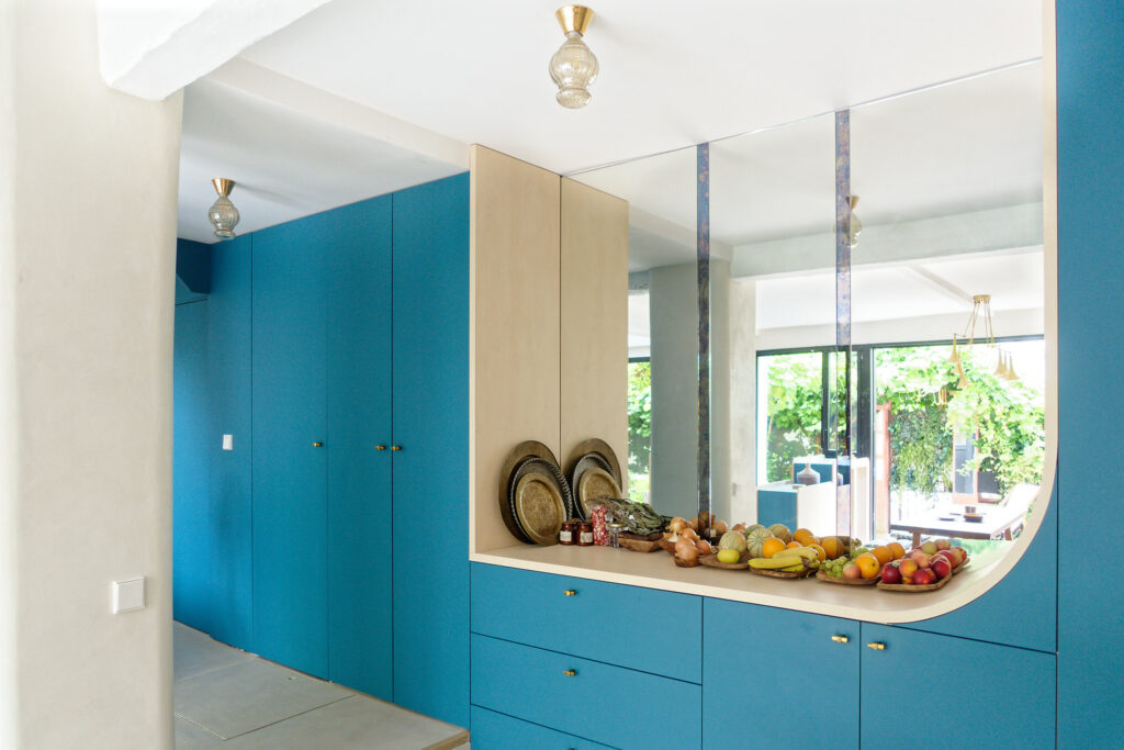 La couleur bleue se retrouve sur les meubles qui tapissent le fond de la pièce. De hauteurs différentes, ils permettent de positionner des miroirs, apportant la lumière qui manquait au fond de la pièce. Les arrondis apportent de la douceur à tous les détails de cette maison.