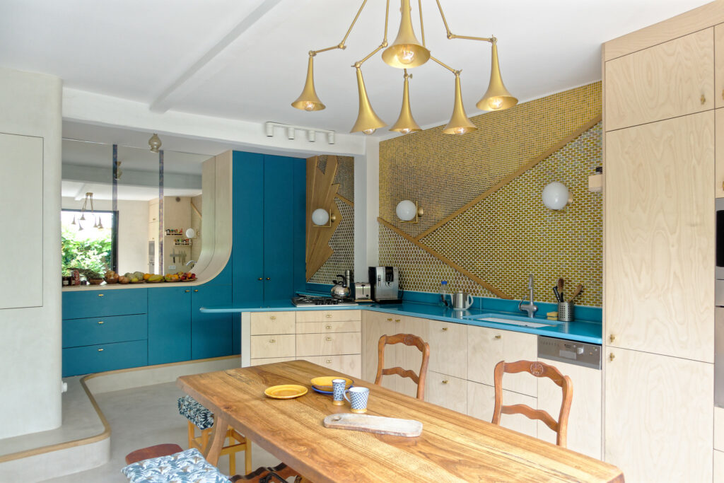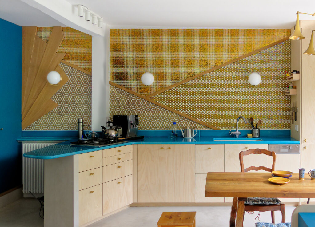 Gros plan sur la cuisine avec sa crédence dorée, ses rayons lumineux de bois, son plan de travail en lave émaillé, ses portes en contreplaqué de bouleau vernies, ses appliques.