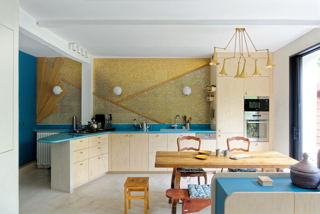 La cuisine est la pièce maîtresse de la maison. Très grande, elle se passe de meubles hauts et a permis la pose d’une crédence dessinée sur mesure à base de différentes mosaïques dorées. Un dessin dans l’esprit art déco à base de lignes triangulaires et de bois. Le doré se retrouve dans les poignées et dans la suspension. Le bois des portes est clair et lumineux, comme le sol en béton ciré. Le plan de travail en lave émaillée bleu lagon donne une profondeur colorée à l’ensemble.