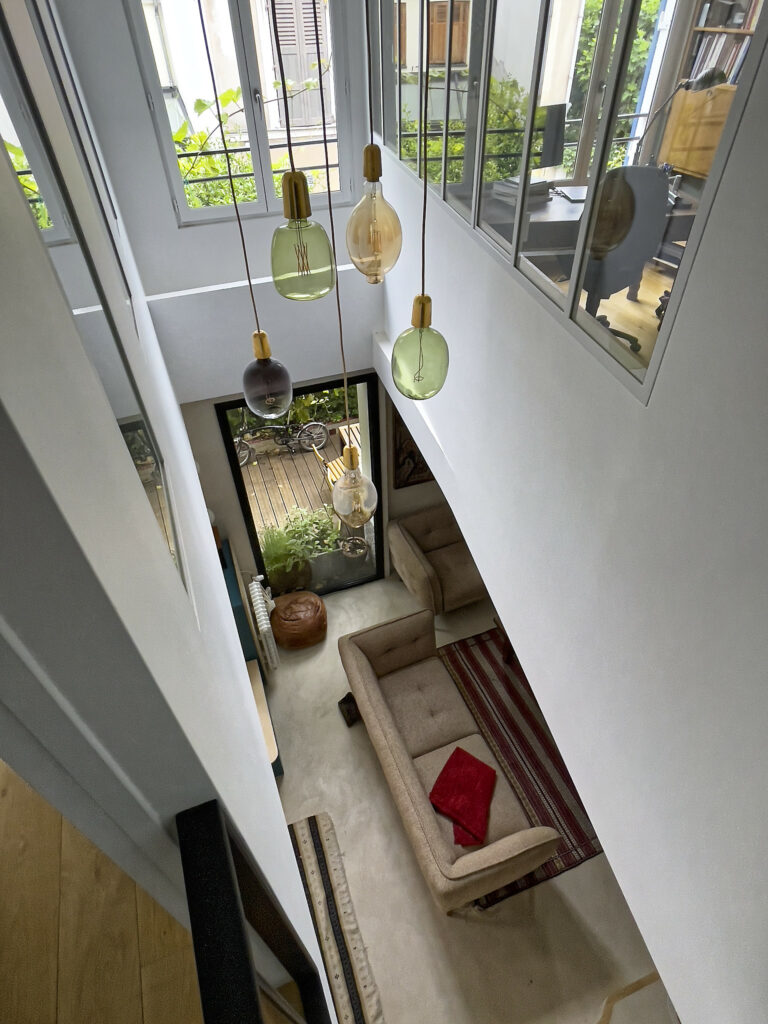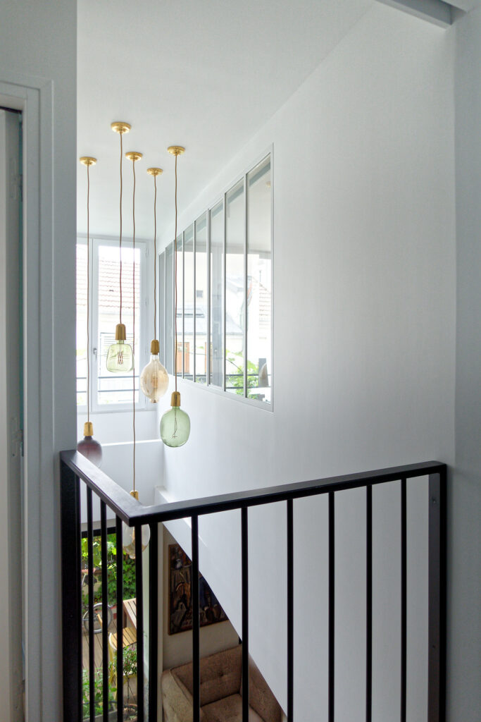 Face à l’escalier, dans le but d’apporter de la lumière en profondeur dans cette maison mono-exposée, une percée a été réalisée dans le plancher du premier étage. La double hauteur créée apporte lumière et volume.