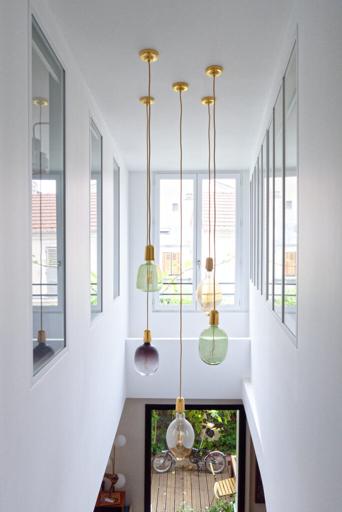 La double hauteur est habillée de suspensions en verre coloré qui jouent sur la verticalité pour lier le haut et le bas.