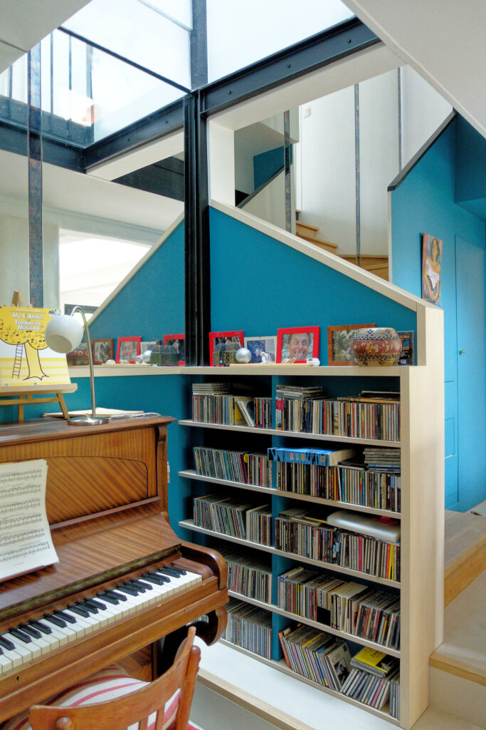 Cet espace musique profite d’un puit de lumière qui avait été créé dans ce précédent travaux. L’allègement de la structure de l’escalier a permis que la lumière rentre encore plus par ce puit jusqu’au rez-de-chaussée. Et toujours cet effet magique des miroirs qui double la luminosité!