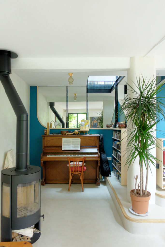 Dans le salon, un espace pour le piano se positionne à côté du poêle à bois qui a remplacé l’ancienne cheminée. Les miroirs au dessus du piano viennent apporter de la lumière supplémentaire en reflétant les fenêtres situées à l’opposé.