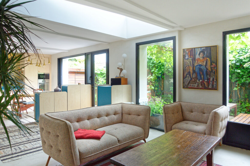 L’ancienne porte d’entrée a été remplacée par un grand vitrage fixe. Le salon profite donc maintenant de deux grandes fenêtres et de plus de lumière.