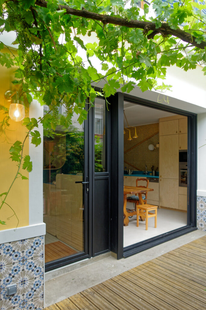 La porte d’entrée à été déplacée pour fluidifier la circulation. Elle se trouve maintenir pile en face de la porte qui donne sur rue. Les menuiseries des fenêtres sont noires et la grande baie vitrée est à galandage ce qui permet un rapport avec l’extérieur très ouvert.
